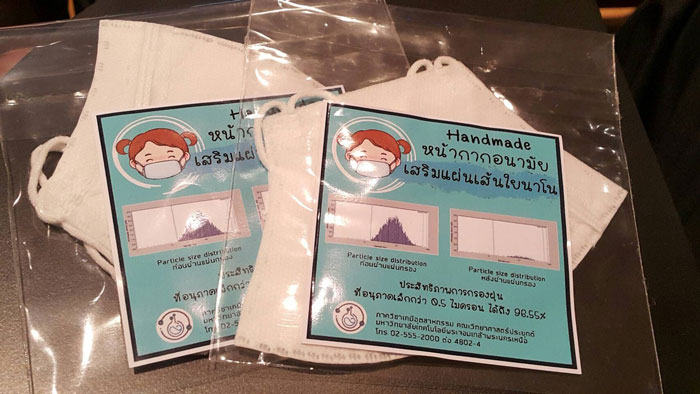 มจพ. โชว์นวัตกรรมหน้ากากอนามัย เสริมแผ่นเส้นใยนาโนกรองฝุ่นและไวรัส 96.55% รศ.ดร.นพวรรณ ชนัญพานิช หัวหน้าศูนย์วิจัยบูรณาการนาโน สำนักวิจัยวิทยาศาสตร์และเทคโนโลยี และ ภาควิชาเคมีอุตสาหกรรม คณะวิทยาศาสตร์ประยุกต์ มหาวิทยาลัยเทคโนโลยีพระกล้าพระนครเหนือ (มจพ.)เจ้าของผลงานและนวัตกรรม “หน้ากากอนามัย เสริมแผ่นเส้นใยนาโน” ที่สามารถกรองฝุ่นและไวรัสได้ดี โดย Handmade “หน้ากากอนามัย เสริมแผ่นเส้นใยนาโน” มีคุณสมบัติพิเศษที่แตกต่างจากหน้ากากอนามัยทั่วไป คือ มีประสิทธิภาพการกรองฝุ่นที่อนุภาคเล็กกว่า 0.5 ไมครอน ได้ถึง 96.55% จากการทดสอบก่อนผ่านแผ่นกรอง และหลังผ่านแผ่นกรอง ที่ใช้ได้จริง save ได้ดีเยี่ยม เหมาะกับสถานการณ์เช่นนี้ที่หน้ากากอนามัยขาดแคลนเป็นอย่างมาก นวัตกรรมหน้ากากอนามัย เสริมแผ่นเส้นใยนาโน มีขนาดความกว้าง 14.5 และยาว 15 ซม. สามารถ DIY ได้ด้วยตนเอง