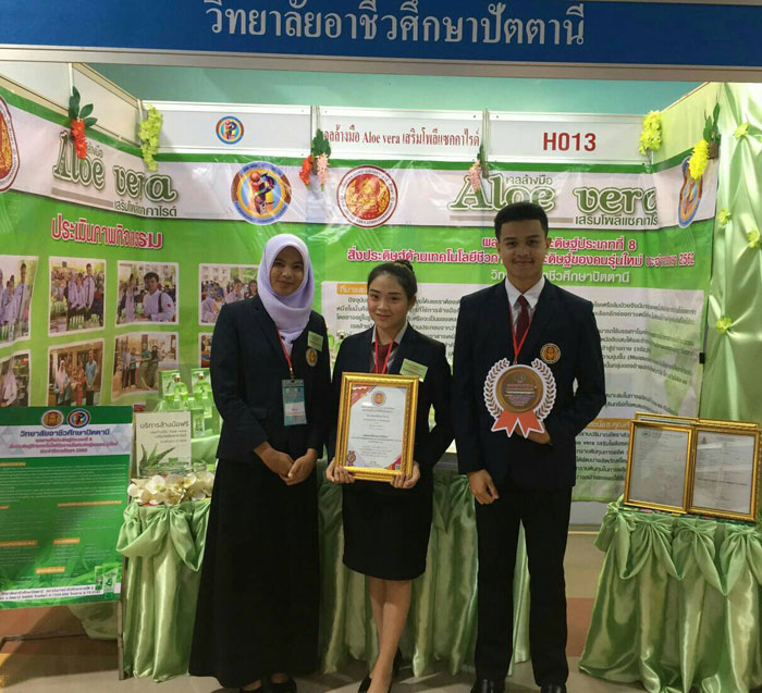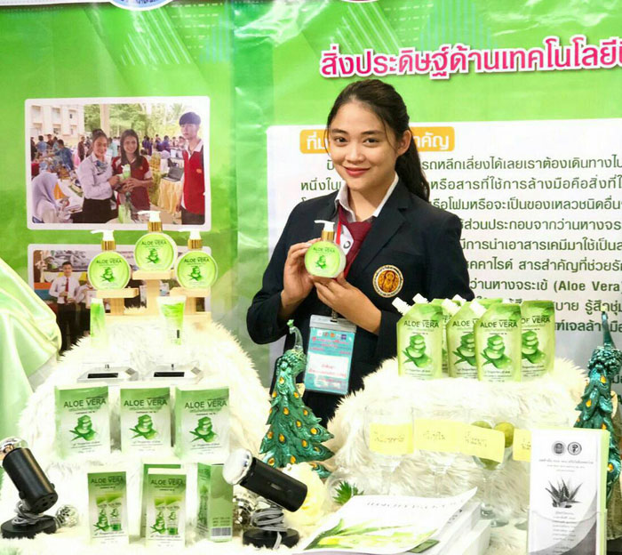 “น้องเบนซ์” หรือ นางสาวสืบศิริ เลนุกูล นักศึกษาชั้น ปวส.1 สาขาการบัญชี วิทยาลัยอาชีวศึกษาปัตตานี เล่าว่า จากการศึกษาข้อมูลพบว่าเจลล้างมือ มีส่วนช่วยในการลดความเสี่ยงจากการรับเชื้อโรคที่มือไปสัมผัสโดยไม่รู้ตัว ซึ่งอาจทำให้เชื้อโรคเข้าสู่ร่างกายและนำไปสู่การเกิดโรคได้ในภายหลัง โดยเจลล้างมือ เป็นผลิตภัณฑ์ทำความสะอาดมือแบบไม่ต้องล้างน้ำ เป็นเสมือนวิธีเสริมหรือทางเลือกสำหรับใช้ในกรณี ไม่สะดวกในการล้างมือด้วยน้ำและสบู่ แต่ปัจจุบันเจลล้างมือที่มีอยู่ในท้องตลาด ยังมีส่วนผสมของสารเคมีที่อาจทำให้เกิดการระคายเคืองและอักเสบของผิวหนัง และทำให้ผิวแห้งกร้านหลังการใช้ ตนและเพื่อนๆ จึงได้ช่วยกันศึกษาคิดค้นสูตรเจลล้างมือที่แตกต่างจากในท้องตลาดโดยผลิตจากธรรมชาติและเป็นมิตรต่อสิ่งแวดล้อม โดยมีครูฮะฟีซุดดีน เจะมุ ครูสาขาวิทยาศาสตร์เป็นครูที่ปรึกษา จนได้เป็นเจลล้างมือ Aloe Vera เสริมโพลีแซคคาไรด์ ที่มีส่วนผสมประกอบด้วยว่านหางจระข้ สารโพลีแซคคาไรด์ น้ำมะนาว กลีเซอรีน และน้ำมันหอมระเหย โดยว่านหางจระเข้มีสรรพคุณเป็นยาฆ่าเชื้อโรค โดยเฉพาะได้เสริมสารสกัดว่านหางจระเข้ที่เรียกว่า “สารโพลีแซคคาไรด์” ซึ่งเป็นสารสกัดชนิดบริสุทธิ์เข้มข้นที่ผลิตจากวุ้นว่านหางจระเข้ผ่านการสกัดด้วยเทคโนโลยีสมัยใหม่โดยใช้น้ำเป็นตัวทำละลายในการสกัด ทำให้ได้สารโพลีแซคคาไรด์ที่มีความปลอดภัยและทำหน้าที่เพิ่มความชุ่มชื้น(Moisturizer) และบำรุงผิวได้อย่างล้ำลึก โดยปกป้องผิวพร้อมลดอาการระคายเคือง ลดเลือนริ้วรอย และช่วยให้ผิวแลดูอ่อนเยาว์ ผ่านการทดสอบด้วยวิธี Agar Diffusion ซึ่งเป็นการทดสอบการยับยั้งปริมาณจุลินทรีย์ทั้งหมดตามมาตรฐานสากล โดยได้ผ่านการรับรองจากสถาบันฮาลาล และสำนักเครื่องมือวิทยาศาสตร์และการทดสอบ มหาวิทยาลัยสงขลานครินทร์ วิทยาเขตหาดใหญ่ ตลอดจนได้ผ่านการทดสอบว่าไม่พบโลหะหนัก ซึ่งเป็นไปตามมาตรฐานผลิตภัณฑ์ชุมชนกำหนดประเภทสบู่เหลว ทำให้ผู้ใช้มั่นใจได้ว่า เจลล้างมือ Aloe Vera เสริมโพลีแซคคาไรด์ สามารถช่วยยับยั้งการเจริญเติบโตของจุลินทรีย์และแบคทีเรียพร้อมกับให้ความรู้สึกถึงสัมผัสผิวที่สดชื่น นุ่มและชุ่มชื้นกว่า ทำให้สามารถใช้ เจลล้างมือ Aloe Vera เสริม โพลีแซคคาไรด์ ได้บ่อยเท่าที่ต้องการ