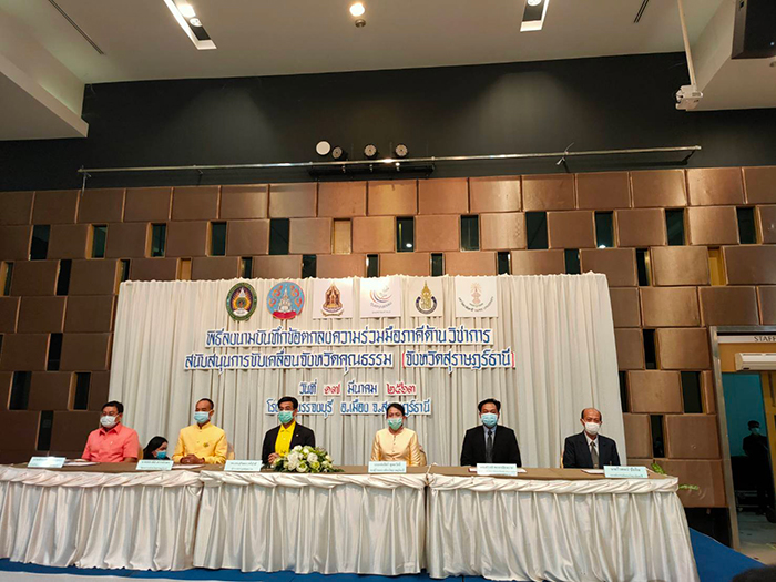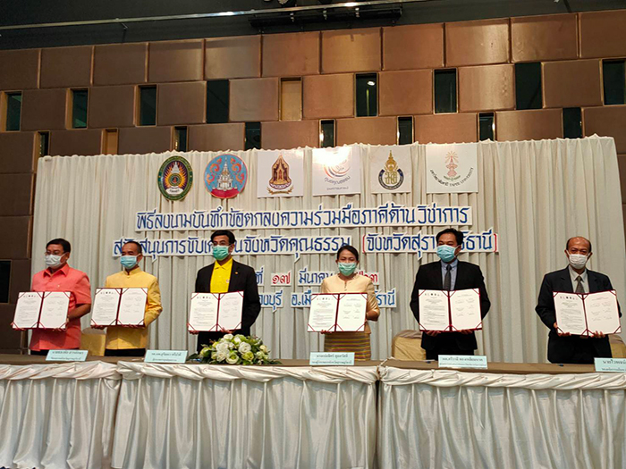 ผศ. ศรีวาลี ทองเลี่ยมนาค ผู้ช่วยอธิการบดีฝ่ายกิจการพิเศษ มหาวิทยาลัยราชภัฏสุราษฎร์ธานี เปิดเผยว่า การลงนามบันทึกข้อตกลงความร่วมมือในครั้งนี้ มีเจตนารมณ์เพื่อส่งเสริม สนับสนุนการดําเนินงานทางวิชาการที่เกี่ยวข้องด้านคุณธรรม จริยธรรม เพื่อสนับสนุนการขับเคลื่อนจังหวัดคุณธรรม จังหวัดสุราษฎร์ธานี เสริมสร้างบทบาท ภารกิจของภาคีความร่วมมือด้านวิชาการ ในการเป็นแหล่งค้นคว้า รวบรวม สนับสนุนการดําเนินงานด้านวิชาการเพื่อตอบสนองความต้องการของสังคม เชื่อมโยงยุทธศาสตร์ชาติ และจังหวัดนําสู่การขับเคลื่อนคุณธรรม ได้อย่างเป็นรูปธรรม ส่งเสริมให้สถาบันการศึกษาขับเคลื่อนคุณธรรมในองค์กร นําไปสู่การเป็นองค์กร คุณธรรมและเป็นพื้นที่เรียนรู้การส่งเสริมคุณธรรมในอนาคต และสนับสนุนการดําเนินกระบวนการทางวิชาการที่เกี่ยวข้องกับการขับเคลื่อน จังหวัดคุณธรรม อาทิ การศึกษาวิจัย การจัดการความรู้ การเข้าร่วมจัดกระบวนการทางวิชาการ การติดตาม ประเมินผล การแลกเปลี่ยนเรียนรู้ที่เอื้อต่อการดําเนินงานของหน่วยงาน องค์กร กลุ่มเครือข่ายทางสังคมต่อไป