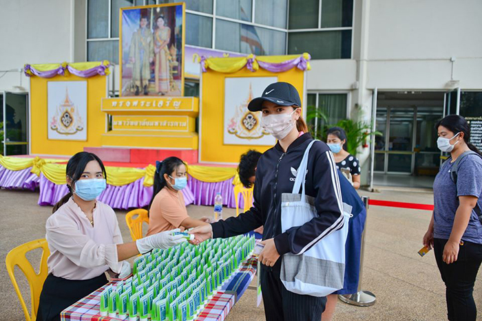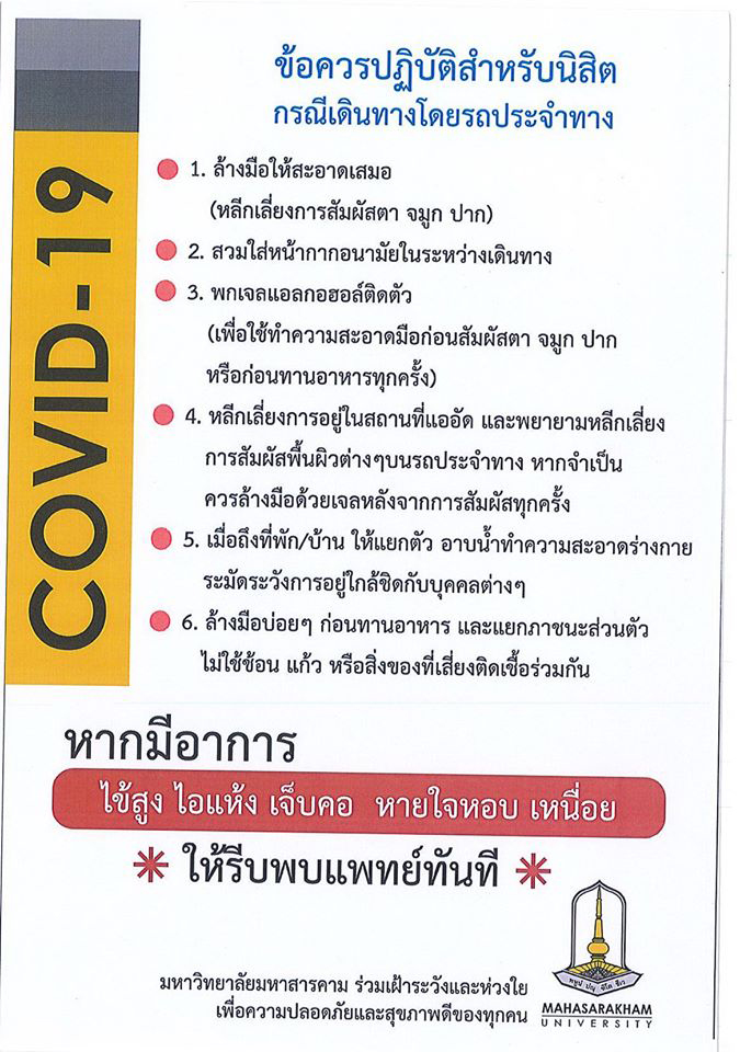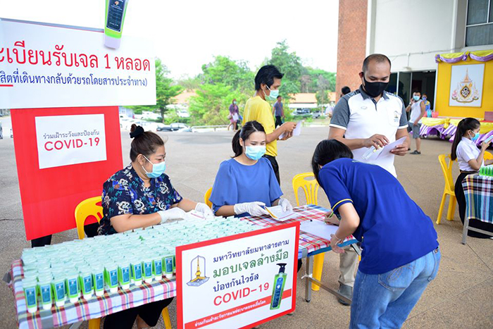 วันนี้ ( 19 มีนาคม 2563) มหาวิทยาลัยมหาสารคาม มอบเจลแอลกอฮอล์ 35 มิลลิลิตร ให้กับนิสิตใช้ในการเดินทางกลับภูมิลำเนา ตามประกาศมหาวิทยาลัยมหาสารคาม เรื่อง มาตรการในการป้องกันการแพร่ระบาดของเชื้อโรค COVID-19 ฉบับที่ 5 โดยมี รองศาสตราจารย์ ดร.ประยุกต์ ศรีวิไล อธิการบดีมหาวิทยาลัยมหาสารคาม พร้อมด้วยผู้บริหาร มหาวิทยาลัยมหาสารคาม มอบเจลแอลกอฮอล์ 35 มิลลิลิตร จำนวน 6,000 หลอด ให้กับนิสิตในการเดินทางกลับภูมิลำเนาโดยสารรถสาธารณะ พร้อมทั้งประชาสัมพันธ์ให้คำแนะนำมาตรการในการป้องกันการแพร่ระบาดของเชื้อโรค COVID-19 และข้อควรปฏิบัติสำหรับนิสิตกรณีเดินทางโดยรถประจำทาง เพื่อให้นิสิตได้ป้องกันตัวเองให้ปลอดเชื้อ COVID-19 พร้อมทั้งคนในครอบครัว