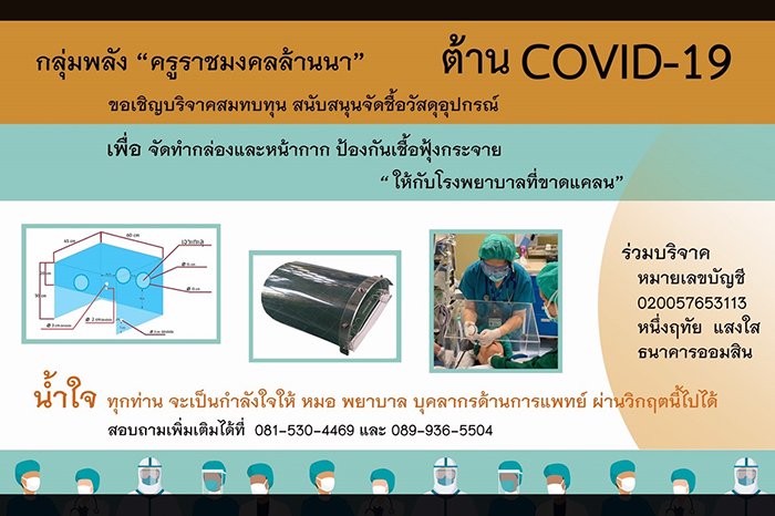 สำหรับกลุ่มพลัง “ครูราชมงคลล้านนาต้าน COVID – 19” ก่อเกิดจากการร่วมตัวของคณาจารย์มหาวิทยาลัยเทคโนโลยีราชมงคลล้านนา คณะวิศวกรรมศาสตร์ และวิทยาลัยเทคโนโลยีและสหวิทยาการรวมถึงศิษย์เก่า ที่ได้นำองค์ความรู้ทางด้านวิศวกรรม ทางด้านการออกแบบ มาประยุกต์ใช้ออกแบบ จัดทำ และจัดหาอุปกรณ์ทางการแพทย์ โดยการขับเคลื่อนกิจกรรมจากสถาบันถ่ายทอดเทคโนโลยีสู่ชุมชน มทร.ล้านนา ที่หลอมรวมองค์ความรู้และทักษะปฏิบัติ ภายใต้บริบทของการทำงานแบบจิตอาสาที่มุ่งสนับสนุนการปฏิบัติงานด้านการแพทย์เพื่อให้ประเทศไทยผ่านพ้นภาวะวิฤติจากไวรัสโคโรนา 2019 (COVID-19)
