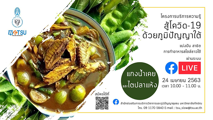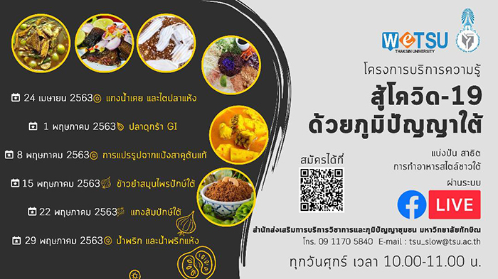 ในสถานการณ์การแพร่ระบาดของเชื้อไวรัสโคโรนา (COVID-19) หลีกเลี่ยงการออกไปในที่สาธารณะ และใช้เวลาที่บ้านมากขึ้น จะกินอะไรก็ต้องระวัง หลายคนเลือกที่จะทำอาหารเองที่บ้าน เพื่อความสะอาดและปลอดภัยจากเชื้อโรคต่างๆ ส่วนใครสนใจการทำอาหารปักษ์ใต้ สไตล์ชาวใต้ สำนักส่งเสริมการบริการวิชาการและวิทยาลัยภูมิปัญญาชุมชน มหาวิทยาลัยทักษิณ (สสช.) ซึ่งมีองค์ความรู้ด้านภูมิปัญญาการทำอาหารทั้งคาวหวานของชาวใต้ โดยใช้วัตถุดิบในท้องถิ่นปักษ์ใต้มาถ่ายทอด แบ่งปันวิธีการทำอาหารสไตล์ชาวใต้ ภายใต้โครงการบริการความรู้สู้โควิด-19 ด้วยภูมิปัญญาใต้ ซึ่งจะเปิดหลักสูตรเรียนการทำอาหารออนไลน์สไตล์ชาวใต้ 6 หลักสูตร ผ่าน Live สด เพจเฟสบุ๊คของสำนักส่งเสริมการบริการวิชาการและวิทยาลัยภูมิปัญญาชุมชน มหาวิทยาลัยทักษิณ (สสช.) ทุกวันศุกร์ เวลา 10.00 – 11.00 น. ซึ่งมีหลักสูตรที่เปิดสอน ดังนี้