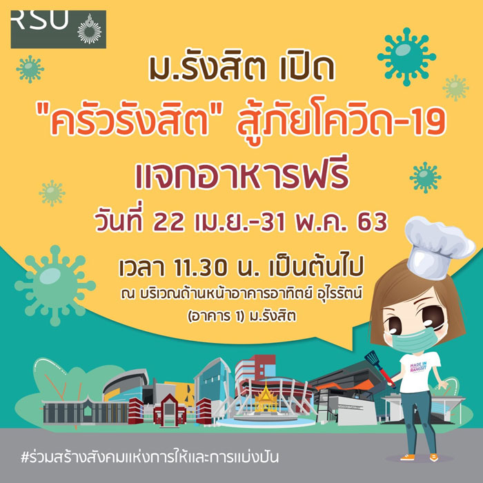 มหาวิทยาลัยรังสิต จัดตั้ง “ครัวรังสิต สู้ภัย COVID-19” เพื่อทำอาหารแจกให้แก่นักศึกษา และบุคคลทั่วไปที่ได้รับผลกระทบจาก COVID-19 เพื่อเป็นส่วนหนึ่งในการแบ่งเบาความทุกข์ของประชาชน และร่วมสร้างสังคมแห่งการให้และการแบ่งปัน โดยขอความร่วมมือทุกท่านที่เข้ามารับอาหารปฏิบัติตามขั้นตอนต่างๆ ตามมาตรการคัดกรองและป้องกันของมหาวิทยาลัย และใส่หน้ากากอนามัย เริ่มตั้งแต่วันที่ 22 เมษายน - วันที่ 31 พฤษภาคม 2563 ณ บริเวณด้านหน้าอาคารอาทิตย์ อุไรรัตน์ (อาคาร 1) มหาวิทยาลัยรังสิต