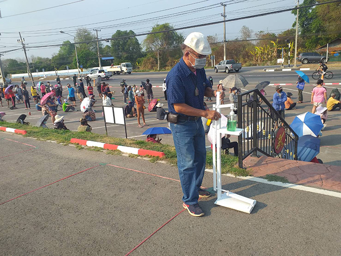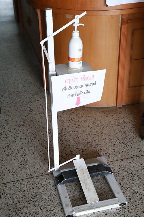ผศ.ระบิน ปาลี อาจารย์สาขาวิศวกรรมไฟฟ้า คณะวิศวกรรมศาสตร์ มทร.ล้านนา สาธิตการใช้งานเครื่องกดเจลแอลกอฮอล์แบบเหยียบเท้า ที่ร่วมกับทีมเจ้าหน้าที่ของมหาวิทยาลัยออกแบบและสร้างขึ้น จากแนวคิดที่ต้องการลดการสัมผัสของบุคคลกับขวดเจลแอลกอฮอล์สาธารณะ ทั้ง ตามหน่วยงานราชการ เอกชน และ ตามร้านค้าต่าง ๆ ที่อาจเสี่ยงต่อการติดเชื้อไวรัสโควิด 19 ที่กำลังแพร่ระบาดอยู่ในขณะนี้