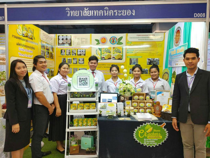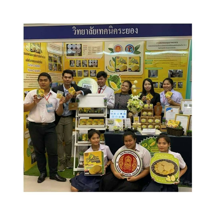 น้องกุ๊กไก่ หรือ นายรณยศ คุ้มท้วม นักศึกษาชั้นปวช. 3 สาขาวิชาอาหารและโภชนาการ วิทยาลัยเทคนิคระยอง เล่าว่า แครกเกอร์ทุเรียน เกิดจากความคิดที่ตน และเพื่อน ๆ รวมทั้งครูมานิดา หยาดทอง สาขาวิชาอาหารและโภชนาการซึ่งเป็นครูที่ปรึกษา ต้องการช่วยเหลือเกษตรกรโดยนำทุเรียนที่ล้นตลาด มาแปรรูปเพื่อสร้างมูลค่าเพิ่ม โดยนำมาเป็นส่วนผสมหลักในการทำแครกเกอร์ทุเรียน ที่มีสูตรแตกต่างจากท้องตลาด โดยเน้นสำหรับคนรักสุขภาพ ปลอดไขมันทรานส์ และผู้ที่แพ้แป้งสาลี โดยจากการศึกษาพบว่าทุเรียนสายพันธุ์หมอนทองสามารถช่วยลดระดับไขมันหรือคอเลสเตอรอลได้เพราะมีสารโพลีฟีนอล (Pholyphenols) และมีเส้นใยที่ช่วยลดไขมัน ตลอดจนมีสารต้านอนุมูลอิสระ