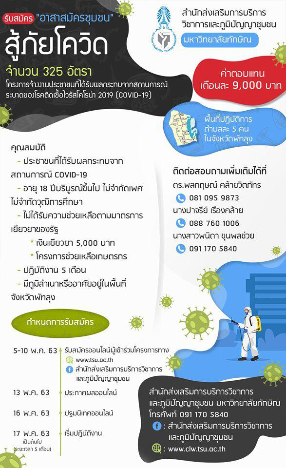 รศ. ดร. ณฐพงศ์ จิตรนิรัตน์ รองอธิการบดีฝ่ายวิจัยและบริการวิชาการ มหาวิทยาลัยทักษิณ กล่าวว่า ในฐานะที่เป็นผู้รับผิดชอบหลักในการดำเนินโครงการจ้างงานประชาชนที่ได้รับผลกระทบจากสถานการณ์ดังกล่าว มหาวิทยาลัยจะดำเนินการเปิดรับสมัครประชาชนทั่วไปที่ว่างงาน ตั้งแต่วันที่ 5 – 10 พฤษภาคม 2563 และประกาศผลในวันที่ 13 พฤษภาคม 2563 รับจำนวน 325 อัตรา ค่าตอบแทนคนละ 9,000 บาทต่อเดือน ระยะเวลาจ้างงาน5 เดือน ตั้งแต่เดือนพฤษภาคม – กันยายน 2563