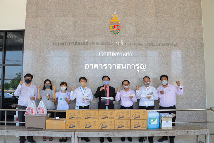 ผู้ช่วยศาสตราจารย์ไพศาล บุรินทร์วัฒนา อธิการบดีมหาวิทยาลัยเทคโนโลยีราชมงคลสุวรรณภูมิ พร้อมด้วยผู้บริหาร และเจ้าหน้าที่ร่วมมอบหน้ากากเฟสชิว (face shield) เจลแอลกอฮอล์ล้างมือแบบพกพา แอลกอฮอล์ และน้ำดื่ม ให้กับบุคลากรทางการแพทย์ใช้ปฏิบัติหน้าที่เพื่อป้องกันการติดเชื้อไวรัสโคโรนา ๒๐๑๙ (COVID – 19) และเป็นกำลังใจให้กับบุคลากรทางการแพทย์ฝ่าวิกฤตครั้งนี้ไปด้วยกัน โดยมี นายแพทย์ประเสริฐ ตั้งจิตธรรม ผู้อำนวยการโรงพยาบาลสมเด็จพระสังฆราชเจ้า กรมหลวงชินวราลงกรณ (วาสนมหาเถร) เป็นผู้รับมอบ ณ อาคารวาสนการุญ โรงพยาบาลสมเด็จพระสังฆราชเจ้า กรมหลวงชินวราลงกรณ (วาสนมหาเถร) ตำบลบ่อโพง อำเภอนครหลวง จังหวัดพระนครศรีอยุธยา
