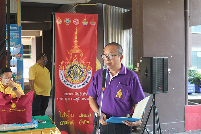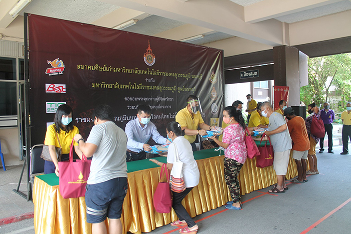 อาจารย์จิระวัฒน์ ใจอ่อนน้อม รองอธิการบดีมหาวิทยาลัยเทคโนโลยีราชมงคลสุวรรณภูมิ (มทร.สุวรรณภูมิ) ศูนย์นนทบุรี พร้อมด้วย นายวัลลภ มานะธัญญา กรรมการ สภามหาวิทยาลัยฯ ผู้ทรงคุณวุฒิ และ นายฐิตินพ พนังวิเชียร นายกสมาคมศิษย์เก่ามทร.สุวรรณภูมิ นนทบุรี มอบชุดถุงยังชีพให้แก่ ประชาชนที่อาศัยอยู่ในชุมชนบริเวณเขตพื้นที่เทศบาลนครนนทบุรี และนักศึกษา จำนวน ๕๒๐ ชุด เพื่อบรรเทาความเดือดร้อนและแบ่งเบาภาระในสถานการณ์การแพร่ระบาดเชื้อไวรัสโคโรนา (COVID -19) ณ มหาวิทยาลัยเทคโนโลยีราชมงคลสุวรรณภูมิ ศูนย์นนทบุรี (เขตใต้)