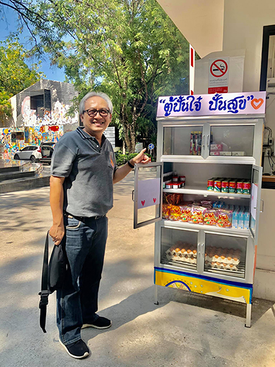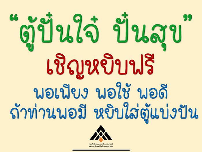 เมื่อวันที่ 12 พฤษภาคม 2563 คณะผู้บริหาร คณาจารย์ บุคลากรคณะศิลปกรรมและสถาปัตยกรรมศาสตร์ มหาวิทยาลัยเทคโนโลยีราชมงคลล้านนา ร่วมจัดตั้ง “ตู้ปั๋นใจ๋ ปั๋นสุข” นำสิ่งของอุปโภค บริโภคแจกจ่ายเพื่อแบ่งเบาภาระประชาชนในวิกฤต COVID-19 ภายในตู้มีอาหารสำเร็จรูปและกึ่งสำเร็จรูป ตลอดจนของอุปกรณ์ที่จำเป็นต่อการดำรงชีวิตประจำวัน ประชาชนท่านใดมีความประสงค์จะบริจาคและรับบริจาคสิ่งของใน “ตู้ปั๋นใจ๋ ปั๋นสุข” สามารรับได้ ณ ด้านหน้า มทร.ล้านนา (เจ็ดยอด) ตั้งแต่วันนี้เป็นต้นไป