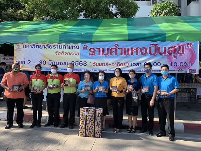 รองศาสตราจารย์สุวรรณี เดชวรชัย คณบดีคณะบริหารธุรกิจ มหาวิทยาลัยรามคำแหง พร้อมอาจารย์ ดร.ณัฐวุฒิ ฮันตระกูล ประธานกรรมการบริหารโครงการบริหารธุรกิจมหาบัณฑิต คณะบริหารธุรกิจ และคุณอิศราภรณ์ โชติช่วง ผู้จัดการ บิ๊กซี ซุปเปอร์เซ็นเตอร์ สาขาหัวหมาก พร้อมด้วยคณาจารย์ เจ้าหน้าที่ ร่วมแจกอาหาร เครื่องดื่ม และของใช้จำเป็นแก่นักศึกษา ประชาชน ที่ได้รับผลกระทบจากสถานการณ์การแพร่ระบาดของโรคโควิด-19 ในกิจกรรม "รามคำแหงปันสุข" เมื่อวันที่ 15 มิถุนายน 2563ณ บริเวณประตูทางเข้าด้านงานแพทย์และอนามัย มหาวิทยาลัยรามคำแหง