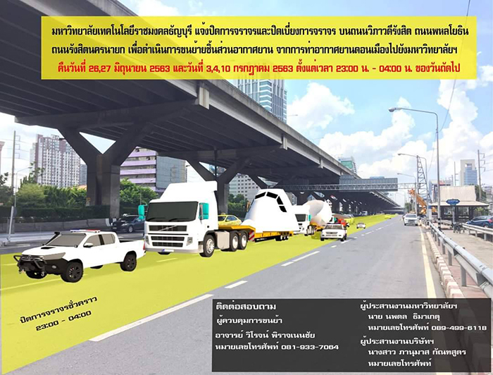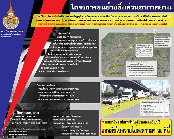 มหาวิทยาลัยเทคโนโลยีราชมงคลธัญบุรี แจ้งข่าวประชาสัมพันธิ์ เรื่องการขนย้ายชิ้นส่วนอากาศยาน (เครื่องบิน) จากสนามบินดอนเมืองไปยังมหาวิทยาลัยฯ ที่คลองหกธัญบุรี โดยทางมหาวิทยาลัยจะเริ่มมีการขนย้ายภายในวันศุกร์ ที่26 มิ.ย. ช่วงเวลา 23:00 -04:00 น.ที่จะถึงนี้