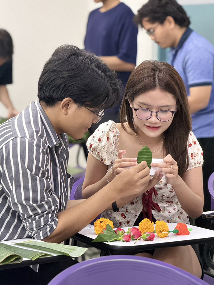 วิทยาลัยนานาชาติ มหาวิทยาลัยรังสิต จัดกิจกรรมในรายวิชา Thai Language for Beginner ในช่วงเทศกาลลอยกระทง ผ่านการประดิษฐ์ “กระทง” จากวัสดุธรรมชาติอย่างใบตองและดอกไม้สด โดยมีอาจารย์ผู้สอนให้คำแนะนำอย่างใกล้ชิด กิจกรรมดังกล่าวจัดขึ้นเพื่อเปิดโอกาสให้นักศึกษาได้สัมผัสประสบการณ์จริงทางวัฒนธรรมไทย พร้อมฝึกทักษะภาษาไทยไปในเวลาเดียวกัน ทั้งการฟัง พูด และเรียนรู้คำศัพท์ที่เกี่ยวข้องกับประเพณีลอยกระทง บรรยากาศเป็นไปอย่างอบอุ่น สนุกสนาน และเต็มไปด้วยรอยยิ้ม นอกจากจะเป็นการเรียนรู้เชิงวัฒนธรรมแล้ว กิจกรรมนี้ยังช่วยสร้างความเข้าใจในคุณค่าของประเพณีไทยที่สะท้อนถึงความกตัญญูต่อธรรมชาติและแม่น้ำ ตลอดจนเสริมสร้างมิตรภาพระหว่างนักศึกษาต่างชาติและคนไทยให้แน่นแฟ้นยิ่งขึ้น