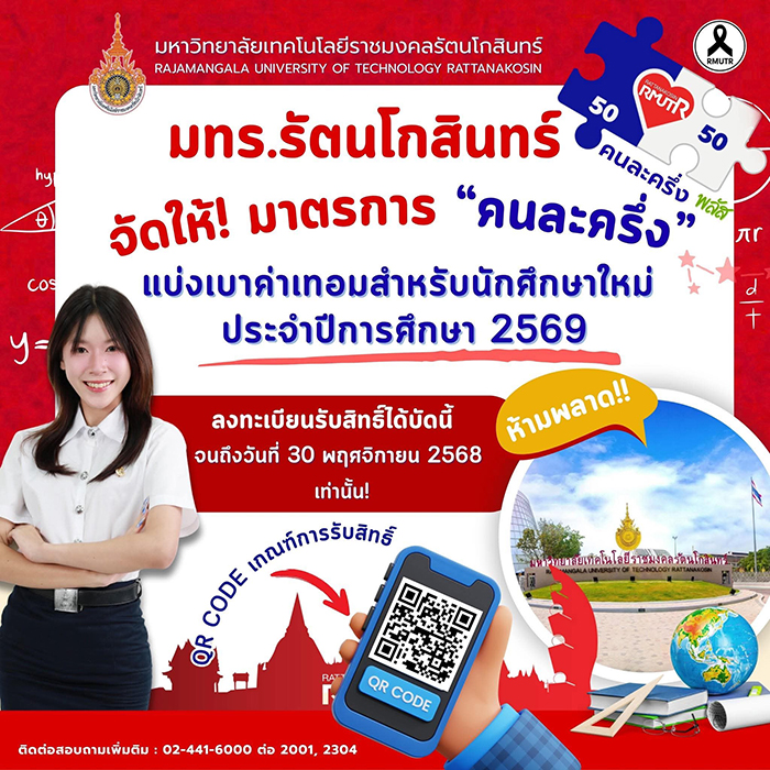 เปิดรับสมัครนักศึกษาใหม่ สู่รั้ว มทร.รัตนโกสินทร์! มทร.รัตนโกสินทร์ จัดให้! มาตรการ “คนละครึ่ง” แบ่งเบาค่าเทอม สำหรับนักศึกษาใหม่ ปีการศึกษา 2569 ลงทะเบียนรับสิทธิ์ได้ตั้งแต่วันนี้ – 30 พฤศจิกายน 2568