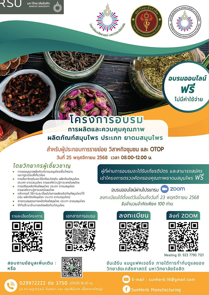 ศูนย์เครื่องมือวิจัยวิทยาศาสตร์และเทคโนโลยี ศูนย์มาตรฐานฮาลาล วิทยาลัยเภสัชศาสตร์ และวิทยาลัยการแพทย์แผนตะวันออก มหาวิทยาลัยรังสิต จัดโครงการอบรม "การผลิตและควบคุมคุณภาพผลิตภัณฑ์สมุนไพร ประเภทยาดมสมุนไพร" สำหรับผู้ประกอบการรายย่อย วิสาหกิจชุมชน และ OTOP โดยไม่เสียค่าใช้จ่าย ในวันอังคารที่ 25 พฤศจิกายน 2568 เวลา 08.00-12.00 น. ออนไลน์ผ่านโปรแกรมซูม