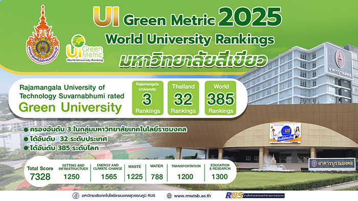 รองศาสตราจารย์ ดร.ประมุข อุณหเลขกะ อธิการบดีมหาวิทยาลัยเทคโนโลยีราชมงคลสุวรรณภูมิ เปิดเผยว่า มหาวิทยาลัยได้รับผลการจัดอันดับ UI GreenMetric World University Rankings 2025 โดยติดอันดับ ที่ 3 ในกลุ่มมหาวิทยาลัยเทคโนโลยีราชมงคล อันดับ ที่ 32 ของประเทศ และอันดับ ที่ 385 ของโลก พร้อมคะแนนรวม 7,328 คะแนน สะท้อนความสำเร็จในการพัฒนาอย่างยั่งยืนอย่างต่อเนื่อง การประเมินครอบคลุม 6 ด้านหลัก ได้แก่ โครงสร้างพื้นฐาน พลังงาน การจัดการของเสีย การใช้น้ำ การสัญจร และการศึกษาและการวิจัย ซึ่งมหาวิทยาลัยโดดเด่นด้านพลังงานและการเปลี่ยนแปลงสภาพภูมิอากาศ (1,565 คะแนน) การศึกษาและวิจัย (1,300 คะแนน) และการจัดการของเสีย (1,225 คะแนน)