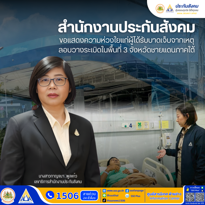 เลขาธิการสำนักงานประกันสังคม เปิดเผยว่า สำนักงานประกันสังคมมีความพร้อมในการดูแลลูกจ้างผู้ประกันตนที่ได้รับผลกระทบจากเหตุการณ์ความไม่สงบในพื้นที่ชายแดนภาคใต้ให้ได้รับสิทธิประโยชน์ตามกฎหมาย
