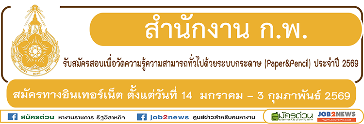 ประกาศสำนักงาน ก.พ. เรื่อง รับสมัครสอบเพื่อวัดความรู้ความสามารถทั่วไปด้วยระบบกระดาษ (Paper&Pencil) ประจำปี 2569 โดยมีรายละเอียดดังต่อไปนี้