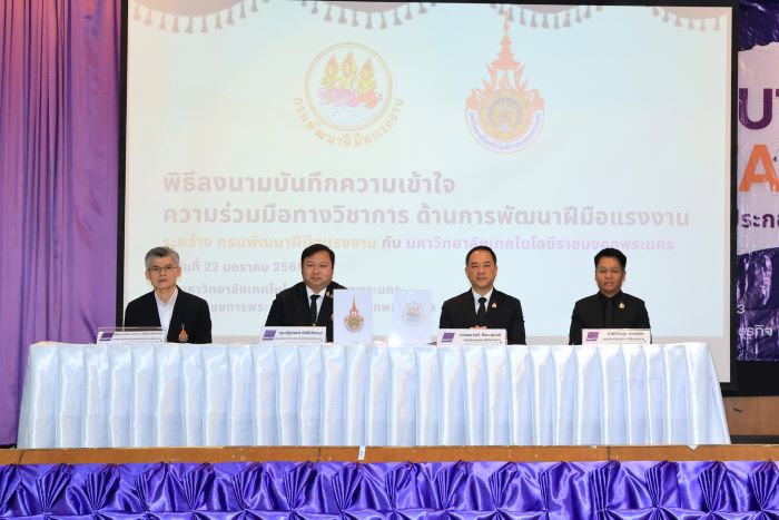 นายสมาสภ์ ปัทมะสุคนธ์ อธิบดีกรมพัฒนาฝีมือแรงงาน เปิดเผยว่า กรมพัฒนาฝีมือแรงงาน มีความยินดีเป็นอย่างยิ่งที่ได้เข้าร่วมพิธีเปิดโครงการ RMUTP Job Fair (นัดพบสถานประกอบการเพื่อแนะนำการรับสมัครงาน) และร่วมลงนามในบันทึกความเข้าใจความร่วมมือทางวิชาการด้านการพัฒนาฝีมือแรงงาน ในวันนี้ ภารกิจหลักของกรม คือ การยกระดับทักษะฝีมือแรงงานให้พร้อมแข่งขันในตลาดโลก ซึ่งการบูรณาการความร่วมมือกับสถานศึกษาถือเป็นกลไกสำคัญตามนโยบายรัฐบาล ที่ผ่านมากรมฯร่วมกับมหาวิทยาลัยจัดตั้งศูนย์ทดสอบมาตรฐานฝีมือแรงงานไปแล้ว 4 สาขา ได้แก่ ด้านการตัดเย็บ การจัดดอกไม้ และการประกอบอาหารไทยระดับ 1 และ 2 และในวันนี้ เป็นการขยายผลความร่วมมือ โดยมุ่งเน้นการพัฒนาหลักสูตรทันสมัยเชื่อมโยงระบบการศึกษา และการเพิ่มศูนย์ทดสอบมาตรฐานฯ อีก 3 สาขา ประกอบด้วย ช่างเมคคาทรอนิกส์ และหุ่นยนต์ ช่างควบคุม PLC และช่างควบคมหุ่นยนต์อุตสาหกรรม นอกจากนี้ยังมีการมอบใบประกาศนียบัตรใบอนุญาตเป็นผู้ดำเนินการทดสอบมาตรฐานฝีมือแรงงาน สาขาอาชีพเครื่องจักรกลและการผลิต สาขาช่างเขียนแบบเครื่องกลด้วยคอมพิวเตอร์ CAD และ สาขาช่างสอบเทียบเครื่องมือวัด (มิติ) มอบป้าย "ศูนย์ทดสอบมาตรฐานฝีมือแรงงาน สถาบันสหวิทยาการดิจิทัลและหุ่นยนต์ และ ป้าย "ศูนย์ทดสอบมาตรฐานฝีมือแรงงาน คณะวิศวกรรมศาสตร์ มหาวิทยาลัยเทคโนโลยีราชมงคลพระนคร อีกด้วย