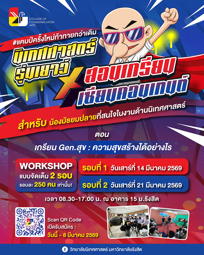 วิทยาลัยนิเทศศาสตร์ มหาวิทยาลัยรังสิต เตรียมระเบิดความมันส์เปิดพื้นที่ให้น้องๆ มัธยมปลายที่มีใจรักในการสื่อสารและงานสร้างสรรค์ มาร่วมปลดปล่อยไอเดีย เรียนรู้การสร้างสรรค์งานด้านนิเทศศาสตร์ ไปกับคณาจารย์และรุ่นพี่วิทยาลัยนิเทศศาสตร์ มหาวิทยาลัยรังสิต ในโครงการนิเทศศาสตร์รุ่นเยาว์ “สอนเกรียนเซียนคอนเทนต์” ตอน เกรียน Gen.สุข: ความสุขสร้างได้อย่างไร