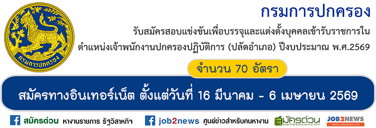 ผู้ประสงค์จะสมัครสอบ สมัครได้ทางอินเทอร์เน็ต ตั้งแต่วันที่ 16 มีนาคม 2569 เวลา 08 .30 น. ถึงวันที่ 6 เมษายน 2569 ตลอด 24 ชั่วโมง ไม่เว้นวันหยุดราชการ ทั้งนี้ ในวันที่ 6 เมษายน 2569 จะปิดรับสมัครสอบเวลา 24.00 น. ที่เว็บไซต์ https://dopa.thaijobjob.com อ่านรายละเอียดที่ไฟล์ประกาศรับสมัคร
