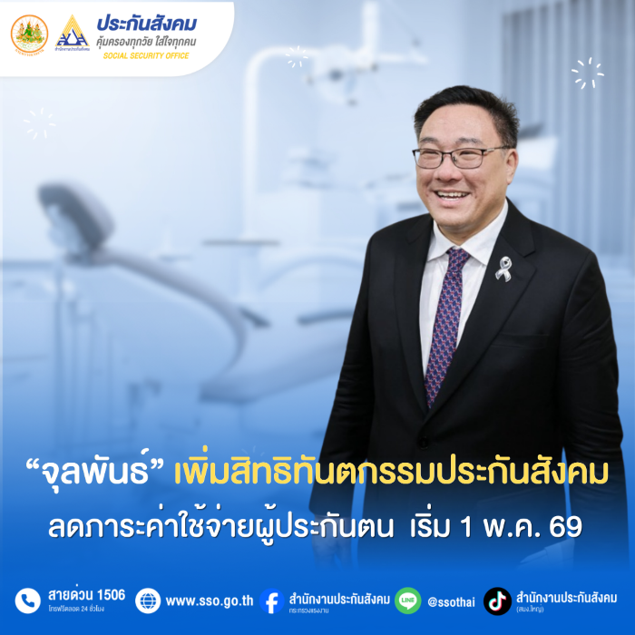 นายจุลพันธ์ อมรวิวัฒน์ รัฐมนตรีว่าการกระทรวงแรงงาน เปิดเผยว่ากระทรวงแรงงานได้มอบหมายให้สำนักงานประกันสังคมพัฒนาสิทธิประโยชน์ด้านทันตกรรมสำหรับผู้ประกันตนตามมาตรา 33 และมาตรา 39 เพื่อยกระดับคุณภาพชีวิต ลดภาระค่าใช้จ่ายด้านสุขภาพ และเพิ่มการเข้าถึงบริการทางการแพทย์อย่างทั่วถึงและมีประสิทธิภาพ ตั้งแต่วันที่ 1 พฤษภาคม 2569 ดังนี้