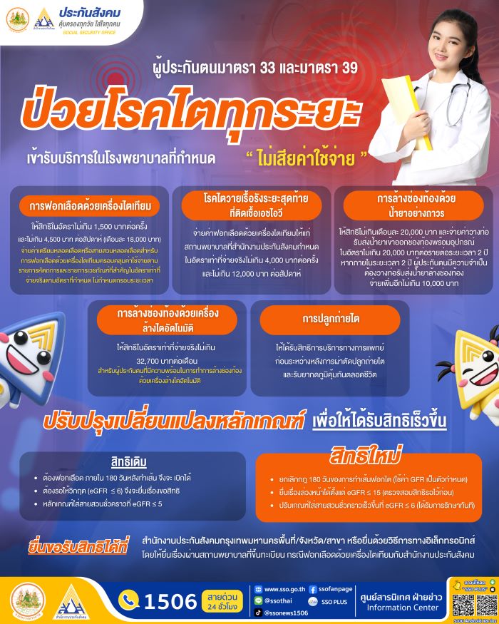 วันที่ 23 เมษายน 2569 นางสาวกาญจนา พูลแก้ว เลขาธิการสำนักงานประกันสังคม เปิดเผยว่าคณะกรรมการการแพทย์และคณะกรรมการประกันสังคม เห็นชอบปรับปรุงหลักเกณฑ์ทางการแพทย์ด้านการบำบัดทดแทนไต เพื่อให้ผู้ประกันตนสามารถเข้าถึงการรักษาได้รวดเร็ว เหมาะสมกับอาการ มีความยืดหยุ่นมากยิ่งขึ้น และผู้ประกันตนไม่ต้องสำรองจ่าย