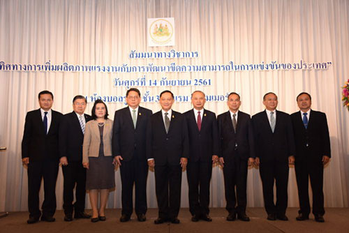 พล.ต.อ.อดุลย์ แสงสิงแก้ว รัฐมนตรีว่าการกระทรวงแรงงาน เป็นประธานในพิธีเปิดการสัมมนาทางวิชาการ เรื่อง ทิศทางการเพิ่มผลิตภาพแรงงานกับการพัฒนาขีดความสามารถในการแข่งขันของประเทศ และร่วมปาฐกถาพิเศษ ในหัวข้อ “การเพิ่มผลิตภาพแรงงานสู่ประเทศไทย 4.0” ณ ห้อง Ballroom 2 ชั้น 3 โรงแรมดิเอมเมอรัลด์ ถนนรัชดาภิเษก กรุงเทพฯ โดยกล่าวว่า จากสถานการณ์ทางโครงสร้างประชากรและตลาดแรงงานของไทย อาทิ การเข้าสู่สังคมผู้สูงอายุ อัตราการเจริญพันธุ์ที่ลดลงในทุกภูมิภาคของประเทศไทย ทำให้สถานการณ์ของกำลังแรงงานในอนาคตประสบกับการลดลงของวัยทำงานและวัยเด็ก และจะมีการพึ่งพิงที่เกิดจากผู้สูงอายุสูงขึ้น ประกอบกับโครงสร้างของจำนวนแรงงานภาคอุตสาหกรรม ภาคการเกษตร และภาคบริการ ไม่เป็นไปในทิศทางเดียวกัน โดยแรงงานภาคการเกษตรซึ่งมีอยู่ถึงประมาณร้อยละ 40 แต่มีผลิตภาพน้อยที่สุด เมื่อเทียบกับภาคอุตสาหกรรมที่มีผลิตภาพสูง จำนวนผู้มีงานทำน้อย รวมถึงปัญหาเชิงโครงสร้างตลาดแรงงาน เช่น การทำงานไม่ตรงกับสาขาที่สำเร็จศึกษา การทำงานต่ำกว่าระดับการศึกษา และคุณภาพแรงงาน ซึ่งประเด็นเหล่านี้ส่งผลต่อผลิตภาพแรงงานทั้งสิ้น