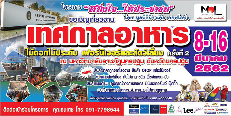 เทศกาลอาหาร เกษตรแฟร์ เฟอร์นิเจอร์ ต้นไม้ และสัตว์เลี้ยง ครั้งที่ 2 ในโครงการ " หนึ่งน้ำใจ..ให้ประชาชน " โดย มูลนิธิมิราเคิล ออฟไลฟ์ฯ ระหว่างวันที่ 8-16 มีนาคม 2562 ณ มหาวิทยาลัยราชภัฏนครปฐม