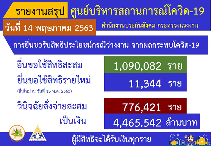 ในการนี้ หม่อมราชวงศ์จัตุมงคล โสณกุล รัฐมนตรีว่าการกระทรวงแรงงาน ได้กล่าวถึง การดำเนินการจ่ายสิทธิประโยชน์ว่างงานจากเหตุสุดวิสัย เพื่อเยียวยาผู้ประกันตนมาตรา 33 ที่ได้รับผลกระทบจากสถานการณ์โควิด-19 ให้ได้รับเงินโดยเร็วที่สุด ซึ่งจากรายงาน มีจำนวนผู้มายื่นขอใช้สิทธิแล้วจนถึงปัจจุบัน (เริ่มยื่นตั้งแต่วันที่ 24 มี.ค. – 13 พ.ค.63) จำนวน 1,090,082 ราย สรุปการจ่ายเงิน ข้อมูล ณ วันที่ (20 เมษายน - 13 พฤษภาคม 2563) สำนักงานประกันสังคมได้อนุมัติสั่งจ่ายไปแล้ว จำนวน 776,421 ราย เป็นเงินจำนวน 4,465.542 ล้านบาท และคาดว่าจะมีผู้ประกันตนมาใช้สิทธิกรณีว่างงานเพิ่มขึ้นอีก เป็นจำนวนมาก ทั้งนี้ ตนขอย้ำความร่วมมือไปยังนายจ้างให้กรอกแบบฟอร์มรับรองการหยุดงานของลูกจ้างผ่าน e-Service ทางเว็บไซต์สำนักงานประกันสังคม www.sso.go.th เพื่อสำนักงานประกันสังคมจะนำเข้าระบบประมวลผลจับคู่ความถูกต้องของข้อมูล แล้วส่งให้หน่วยปฏิบัติวินิจฉัยจ่ายเงินว่างงาน และโอนเงิน เข้าบัญชีธนาคารของผู้ประกันตน ภายใน 3 วันทำการ