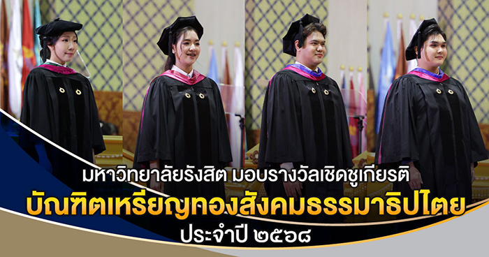 มหาวิทยาลัยรังสิต มอบรางวัลเชิดชูเกียรติบัณฑิตเหรียญทองสังคมธรรมาธิปไตย ประจำปี ๒๕๖๘ แก่บัณฑิตที่ทำกิจกรรมเพื่อส่วนรวม เป็นผู้ที่มีความดี ความงาม มีเป้าหมายเพื่อชีวิตที่ดีงาม พร้อมเป็นพลเมืองที่ดีตามแนวทางแห่งสังคมธรรมาธิปไตย ได้แก่ แพทย์หญิงศุภานัน เจนธีรวงศ์ วิทยาลัยแพทยศาสตร์ นางสาวกชกร ผ่องแผ้ว วิทยาลัยผู้นำและนวัตกรรมสังคม นายณัฏฐกิตติ์ ทุ่ยอ้น วิทยาลัยนิเทศศาสตร์ และนายณภัทร เส็งเกี้ยง วิทยาลัยนิเทศศาสตร์ ในพิธีประสาทปริญญา ประจำปี ๒๕๖๘