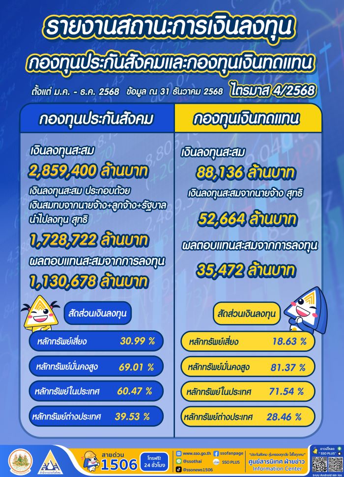 โดย เลขาธิการสำนักงานประกันสังคม ได้กล่าวให้รายละเอียดของกองทุนประกันสังคม ว่าปัจจุบันมีเงินลงทุนสะสมรวมทั้งสิ้น 2,859,400 ล้านบาท ซึ่งเกิดจากเงินสมทบจากฝ่ายนายจ้าง ฝ่ายลูกจ้าง และฝ่ายรัฐบาล จำนวน 1,728,722 ล้านบาท ตลอดระยะเวลาตั้งแต่จัดตั้งกอทุนประกันสังคม สามารถสร้างผลตอบแทนสะสมจากการลงทุนได้สูงถึง 1,130,678 ล้านบาท โดยในปี 2568 สามารถสร้างผลตอบแทนที่รับรู้แล้วได้กว่า 80,000 ล้านบาท หรือคิดเป็นอัตรา 6.1% ของพอร์ตการลงทุน โดยเป็นผลมาจากการจัดกลยุทธ์การลงทุน ที่ให้ความสำคัญกับ เสถียรภาพกองทุน เพื่อการจ่ายสิทธิประโยชน์ในระยะยาวเป็นลำดับแรก โดยลงทุนในหลักทรัพย์มั่นคงสูง 69.01% และหลักทรัพย์เสี่ยง 30.99% ซึ่งแบ่งเป็นการลงทุนในประเทศ 60.47% และต่างประเทศ 39.53%